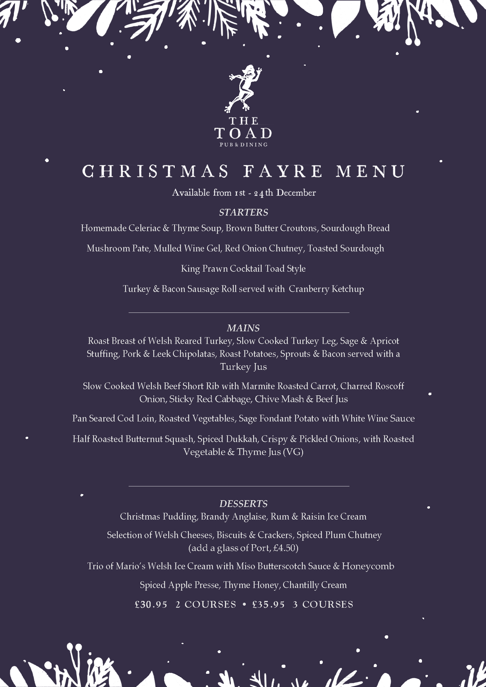 At The Toad we pride ourselves on using only the very best of British seasonal ingredients to craft all of our menus. join us on a journey of discovery as we explore fresh and exciting dishes that reflect ‘the best of British!’